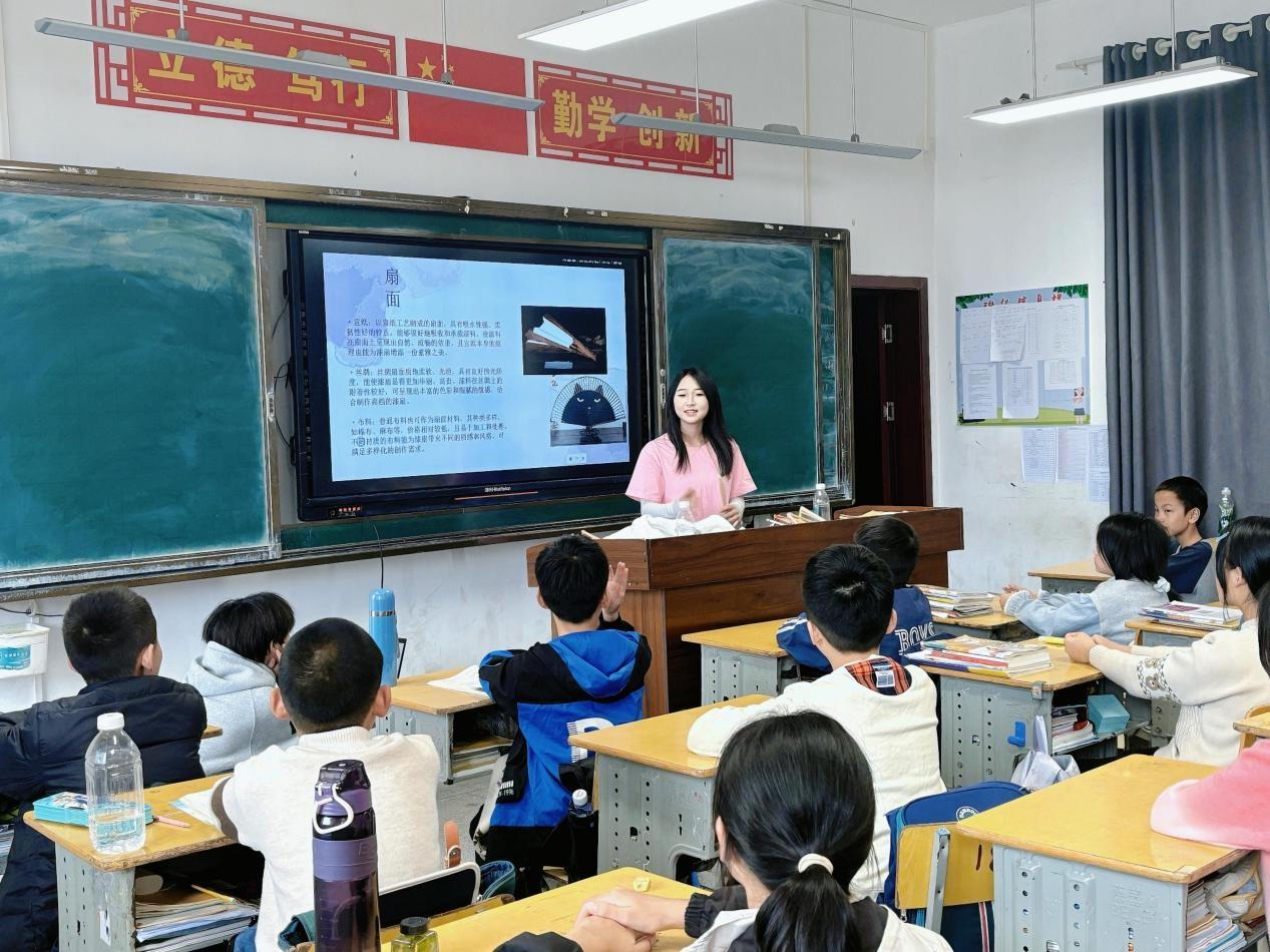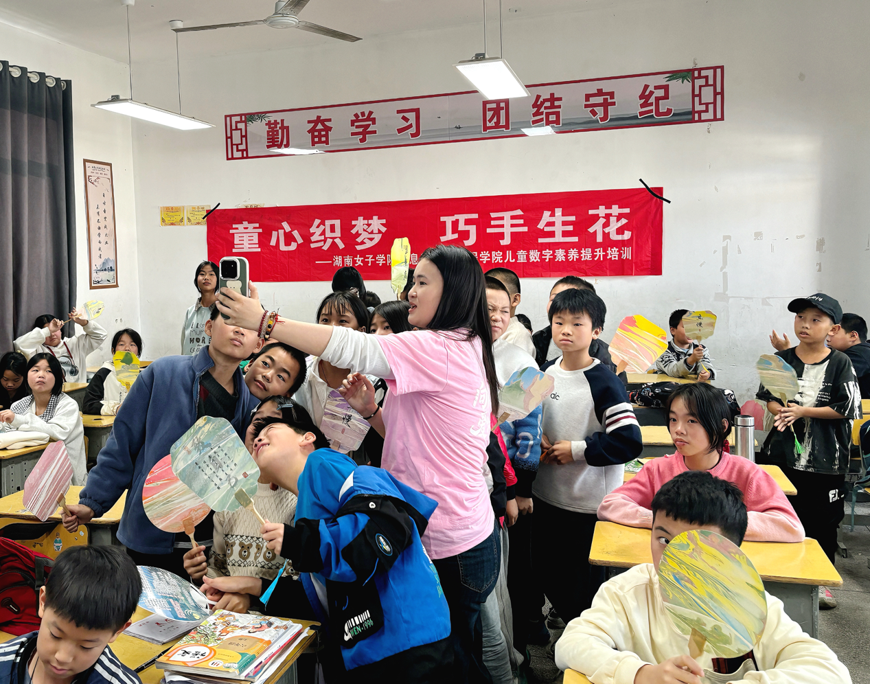 本网讯(信息科学与工程学院 唐谦 邓璐 申宏翔)10月28日,在湖南洪江市熟坪乡的教室内,一场别开生面的漆扇制作活动正热烈开展。孩子们兴奋地高举作品,欢叫道:“老师您看,我的漆扇就像木星一样!”现场气氛活跃,学生们踊跃举手、跃跃欲试,眼中满是对漆扇制作的好奇与期待。这是信息科学与工程学院开展的“童心织梦,巧手生花”儿童智慧素质培养活动的生动一幕。作为落实省重点民生实事——家庭教育指导服务“向阳花”行动的重要环节,该活动依托“爱心妈妈+知心姐姐”结对关爱基层项目,将艺术创作与智慧素养相结合,为乡村儿童带来了一场趣味与成长并重的素质拓展之旅。