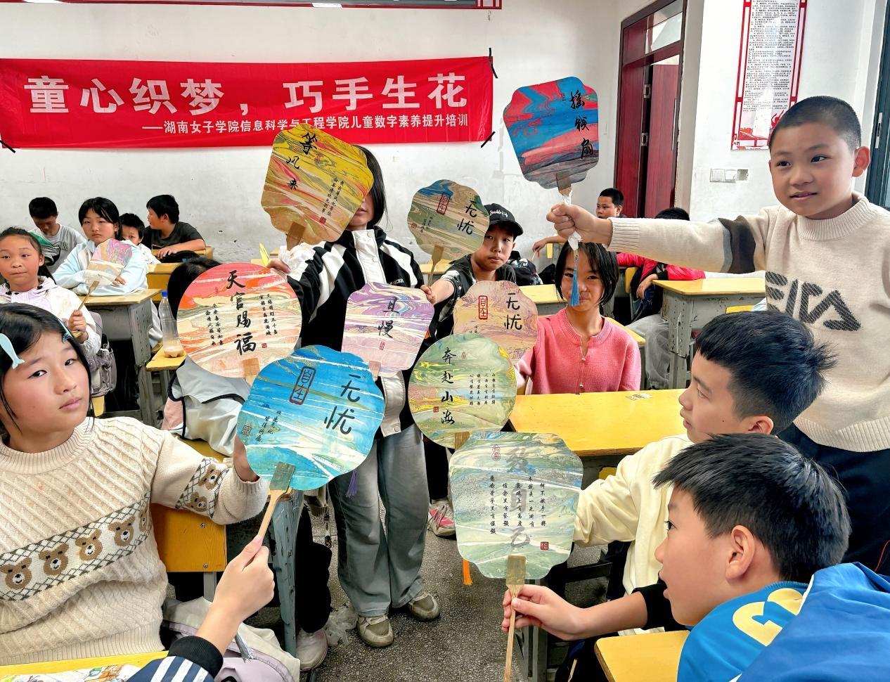 (信息科学与工程学院 唐谦 邓璐 申宏翔)10月28日,在湖南洪江市熟坪乡的教室内,一场别开生面的漆扇制作活动正热烈开展。孩子们兴奋地高举作品,欢叫道:“老师您看,我的漆扇就像木星一样!”现场气氛活跃,学生们踊跃举手、跃跃欲试,眼中满是对漆扇制作的好奇与期待。这是信息科学与工程学院开展的“童心织梦,巧手生花”儿童智慧素质培养活动的生动一幕。作为落实省重点民生实事——家庭教育指导服务“向阳花”行动的重要环节,该活动依托“爱心妈妈+知心姐姐”结对关爱基层项目,将艺术创作与智慧素养相结合,为乡村儿童带来了一场趣味与成长并重的素质拓展之旅。